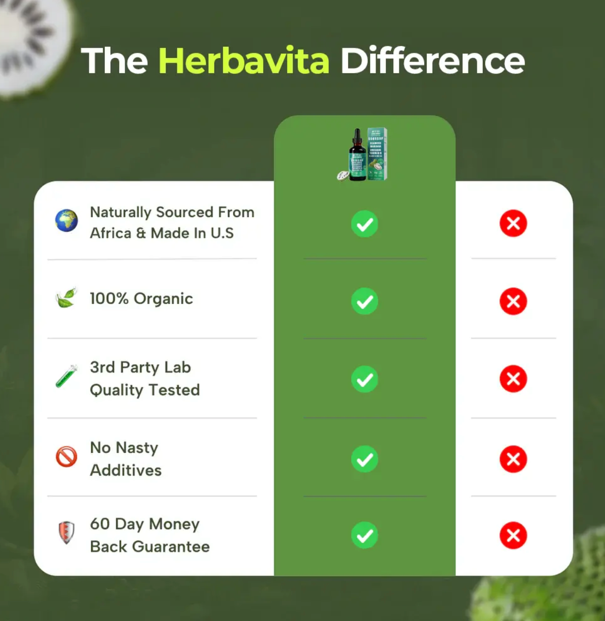 You have 2 months to use 10-in-1 Soursop Extract Drops and experience their benefits. If they work as advertised, you are welcome to keep them and enjoy the comprehensive health support they offers. But if for ANY reason you are not happy with your purchase or you feel like there are better solutions out there…